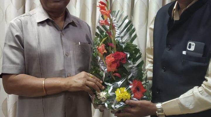 The newly appointed President of Chhattisgarh Sanskrit Vidyamandalam, Dr. Suresh Kumar Sharma had a courtesy call on School Education Minister Dr. Premsai Singh Tekam in his office today. Minister Dr. Tekam congratulated and congratulated Dr. Sharma on getting the new responsibility.