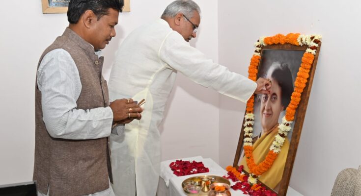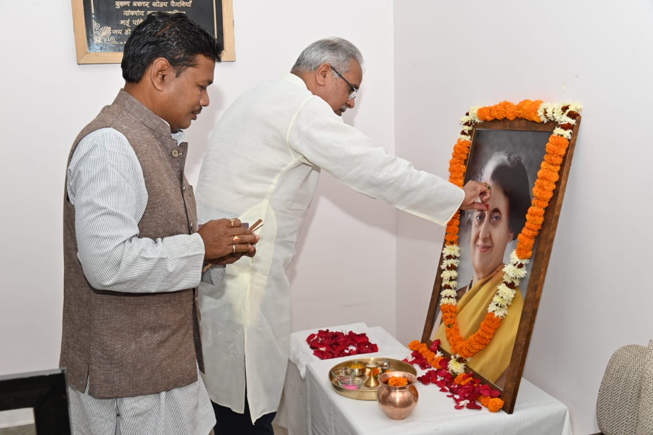 Chief Minister Mr. Bhupesh Baghel paid humble tribute to India’s first woman Prime Minister Bharat Ratna Mrs. Indira Gandhi and Rani Laxmi Bai, the heroine of the first Indian freedom struggle, by lighting a lamp in front of their oil painting and offering flowers on their birth anniversary here today.