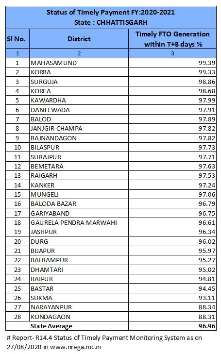 96.79 percent in Balodabazar-Bhatapara district, 96.75 in Gariaband, 96.61 in Gourela-Pendra-Marwahi, 96.34 in Jashpur, 96.02 in Durg, 95.97 in Bijapur, 95.27 in Balrampur-Ramanujganj, 95.02 in Dhamtari, 94.81 in Raipur, 945 in Bastar. In Sukma 93.11, 88.34 in Narayanpur and 88.31 percent in Kondagaon, time-bound wages have been processed.