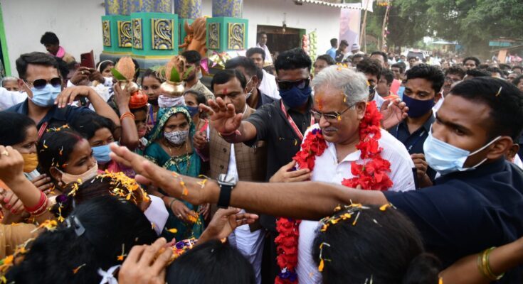 Raipur, 18 October 2021: Chief Minister Bhupesh Baghel, who came to visit Mother Hinglajin at Girola, was accorded a grand welcome. In-charge Minister Shri Kawasi Lakhma and MP Shri Deepak Baij also reached along with Chief Minister Shri Baghel by helicopter. The Chief Minister was welcomed at the temporary helipad built at Girola, Chairman, Bastar Area Development Authority, Mr. Lakheshwar Baghel, Narayanpur MLA Mr. Chandan Kashyap, Chitrakot MLA Mr. Rajman Benzam, CREDA President Mr. Mithilesh Swarnakar, Commissioner Mr. GR Churendra, Inspector General of Police Mr. Sundarraj P, Chief Conservator of Forests Mr. Mohammad Shahid along with public representatives. The occasion was accompanied by traditional folk dances by local folk dancers. The women welcomed the Chief Minister with an aarti on the occasion.