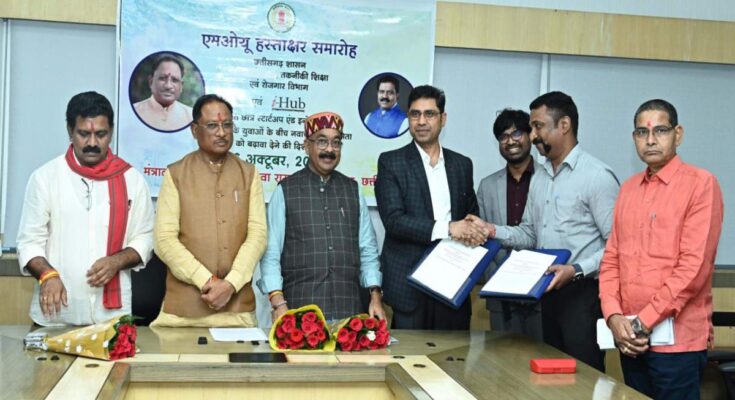 The MoU was signed by Chhattisgarh Technical Education and Employment Secretary Dr. S. Bharatidasan and Gujarat Government Technical Education Commissioner Banchanidhi Pani. Deputy Chief Minister Arun Saw, Food Minister Dayal Das Baghel, Forest and Climate Change Minister Kedar Kashyap, Commerce and Industry Minister Lakhan Lal Dewangan, Finance Minister O.P. Choudhary, Women and Child Development Minister Laxmi Rajwade, Sports and Youth Welfare Minister Tankaram Verma, Chief Minister’s Secretary P. Dayanand, Dr. Basav Raju S, Rahul Bhagat and i-Hub CEO Hiranmay Mahanta, Chhattisgarh Technical Education Director Dr. Priyanka Shukla were also present on the occasion.
