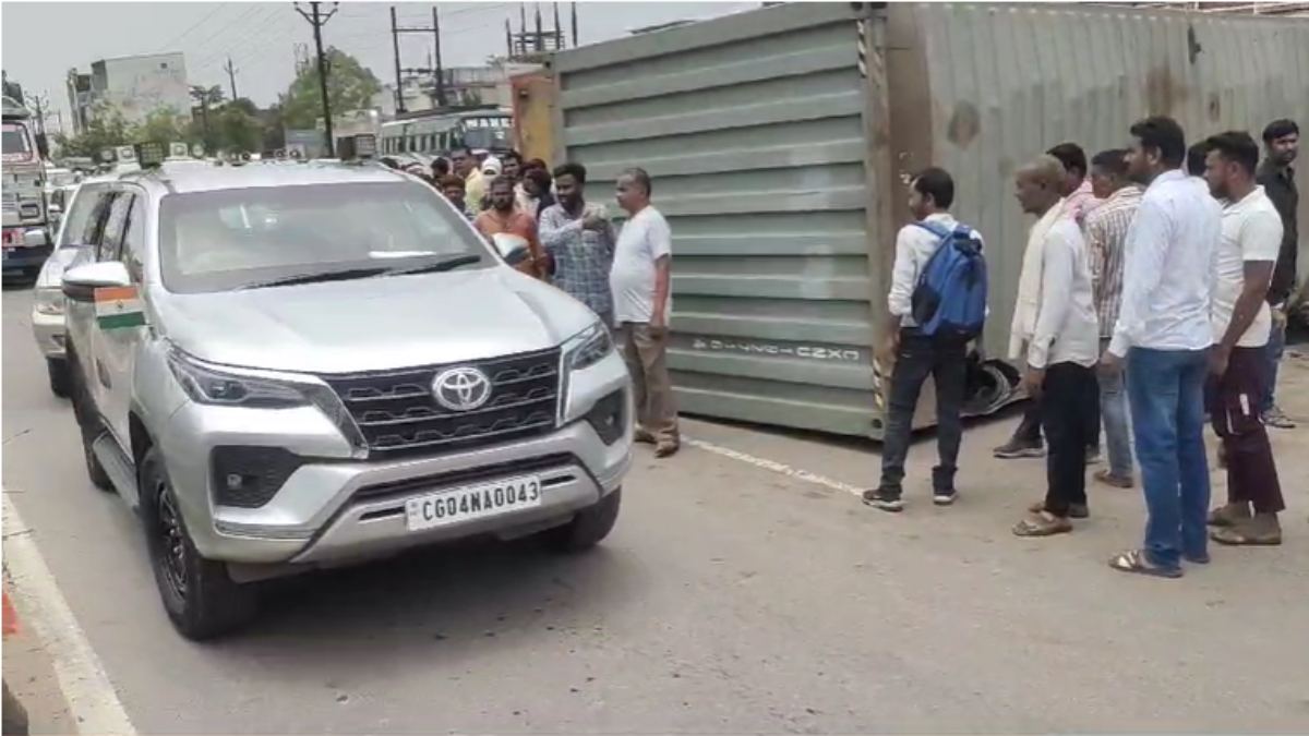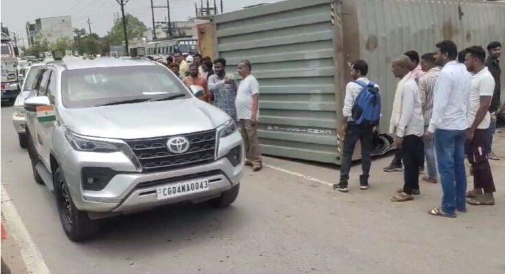 Raipur . A major accident has happened at Pachpedi Naka in the capital. A container went out of control and overturned. Two people riding a bike came under its grip. One person fell off the road while the other’s leg got stuck under the container. The convoy of Vidhan Sabha Speaker Dr. Raman Singh also passed near the spot. The incident has caused a traffic jam on the road. On getting information about the incident, the police reached the spot and started working to restore the traffic system.