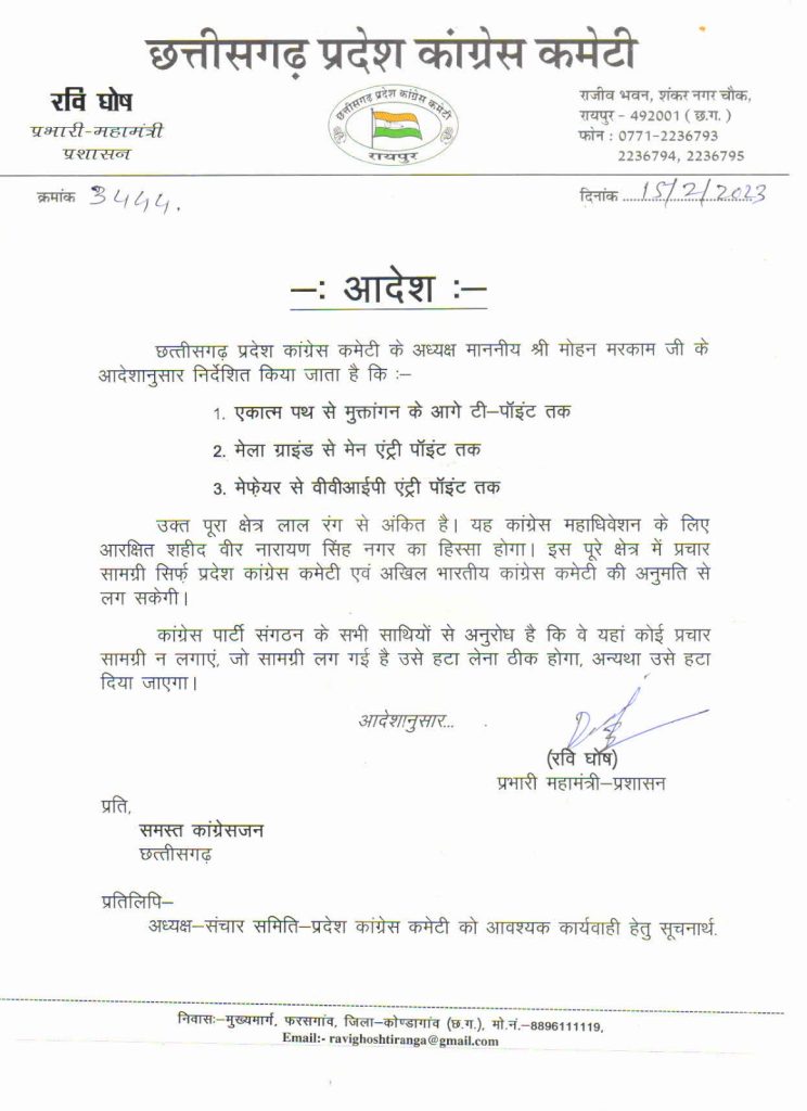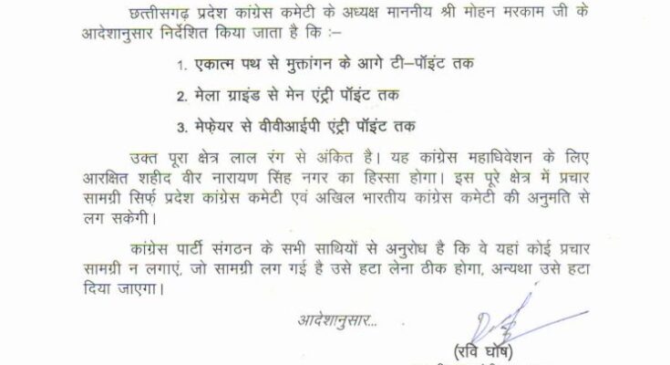 Raipur. An order has been issued on the instructions of PCC Chief Mohan Markam to remove hoardings and cutouts from Nava Raipur. If the hoardings are not removed, the propaganda material should be removed towards the PCC. In the instructions issued by the PCC, three routes from the Ekatma Path to the T-point in front of Muktangan, from the fair ground to the main entry gate and from Mayfair to the VVIP entry point have been described as red corridors. Only PCC and AICC authorized publicity material is allowed to be posted on these routes.