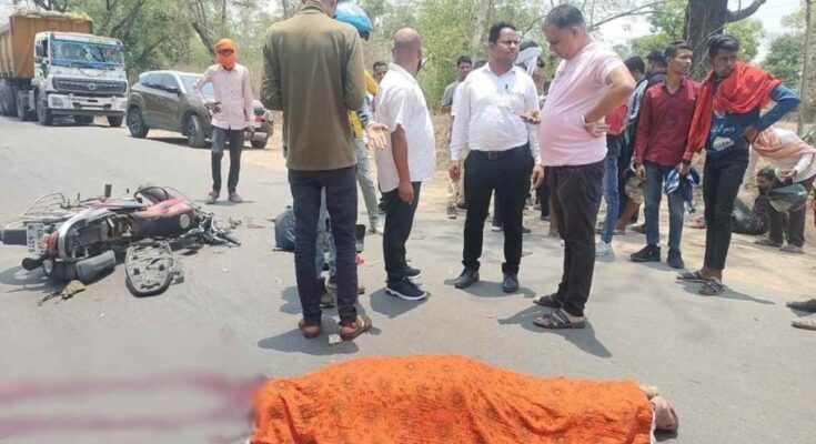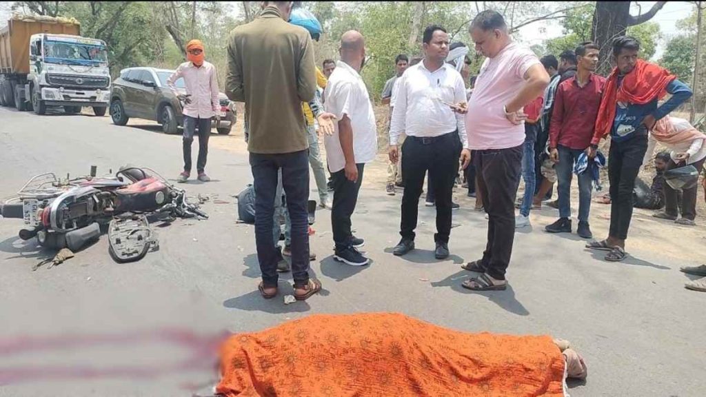 Katghora . A horrific road accident has occurred in Korba district. A speeding Thar hit three people riding a bike hard. The bike driver came under the wheels of a speeding trailer coming from the opposite direction. The bike driver died on the spot in the accident. While the other person riding the bike was seriously injured and a 6-year-old girl suffered minor injuries. This case is of Katghora police station area.