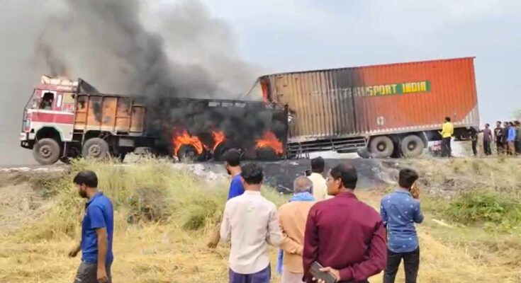 According to the information, the truck full of dust was broken and its tire was being changed. At the same time, a speeding container filled with medicines and other goods hit the truck from behind. Where within no time a massive fire broke out in both the vehicles. On receiving information about the incident, Bemetra SDOP Manoj Tirkey, TI Chandradev Verma and traffic police immediately arrived with the entire team. The fire was controlled with the help of Kawardha and Bemetra fire brigade team.