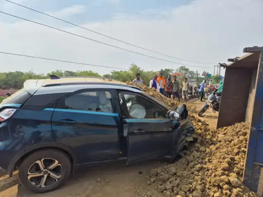 The tractor went out of control and collided with the front part of the car. After this, the trolley filled with soil behind the tractor hit the car and overturned. Due to this, the farmer leader and his mother got trapped inside the car. When people passing by saw the accident, they somehow pulled both of them out by breaking the glass of the car. The car was badly damaged in this accident.