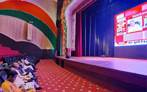 Organization General Secretary Pawan Sahay is watching the election results with party workers in the auditorium of Bharatiya Janata Party. Monitoring of counting of votes from Rajiv Bhawan.