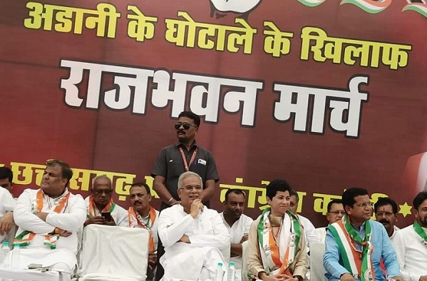 Raipur, 13 march 2023 The Congress marched to the Raj Bhavan on Monday on the Adani issue in the capital Raipur. The leaders protested accusing the Adani Group and the central government of nexus. Chief Minister Bhupesh Baghel addressed the gathering at Ambedkar Chowk. After this, the group of leaders went towards the Raj Bhavan. A memorandum was submitted to the governor demanding an inquiry into the Adani group.