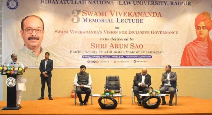 Raipur. Deputy Chief Minister and Law and Legislative Affairs Minister Arun Sao shared his views in the Swami Vivekananda Memorial Lecture at Hidayatullah National Law University (HNLU), Nava Raipur today. In the lecture organized by the University every year on 12 January on the birth anniversary of Swami Vivekananda, the topic this time was ‘Swami Vivekananda’s vision of inclusive governance’. Deputy Chief Minister Sao presented his views in detail in this third event of the annual lecture series. He paid tribute to Swami Vivekananda by paying floral tributes at his statue in the university. Vice Chancellor Prof. (Dr.) V.C. Vivekanandan delivered the inaugural address in the program and Dr. Avinash Samal, Dean of Student Welfare, delivered the welcome address. Deputy Chief Minister Arun Sao, while addressing the students of the university, said that Swami Vivekananda had worked on eliminating social inequality by adopting inclusive governance. Had insisted. Taking the country and countrymen along is inclusive governance, which is happening in India today. He said that the 21st century is India’s century. Our country is ready to lead the world. India is once again moving towards becoming a world leader. India’s strength is increasing in the whole world through inclusive governance and inclusive development. Pradhan Mantri Awas Yojana for the needy, Ujjwala Yojana, Swachh Bharat Mission, which have become mass movements today, all these are examples of inclusive governance. Underlining the thoughts and philosophy of Swami Vivekananda, Saw said that when government schemes for the deprived and needy people If they make it, their lives change. Referring to Swami Vivekananda’s statement ‘Service to man is service to Narayan’, he said that society and country cannot become strong without empowering the weak. For this, inclusive governance is necessary. He gave the formula of ‘Vasudhaiva Kutumbakam’ to the people of the world. Referring to the lecture given by Swami Vivekananda in the Parliament of Religions in Chicago, Sav said that he introduced the whole world to our thinking, way of life, philosophy, social system and concept of family.. Sav said, Western Whatever our spiritual culture had disappeared due to blind imitation of culture, it was re-established. He said that Swami Vivekananda had laid emphasis on an education system full of morality, values and spirituality. He advocated an equal education system for all. He wanted everyone’s participation in democracy and inclusion with everyone’s advice.