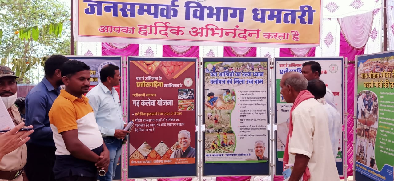 Dhamtari 06 March 2021. Information Camp cum Photograph Exhibition was organized by Public Relations Department in Gram Panchayat Ghathula, City Development Block today. According to the instructions of Collector Shri Jai Prakash Maurya, district level Janchaupal camp was organized in village Ghathula. During this period, a public exhibition was distributed by the Public Relations Department on the basis of various public welfare schemes of the state government.