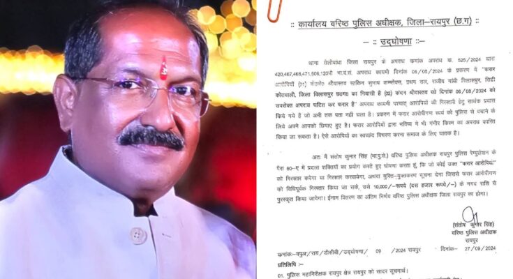 , Raipur. KK Srivastava, who was close to former CM Bhupesh Baghel during the Congress government, has been declared a fugitive by the police. KK Srivastava is accused of cheating of 15 crores and he is continuously absconding. Telibandha police station is continuously searching for him, but has not got success. Meanwhile, now the police has announced a reward for his arrest. According to which whoever gets the accused KK