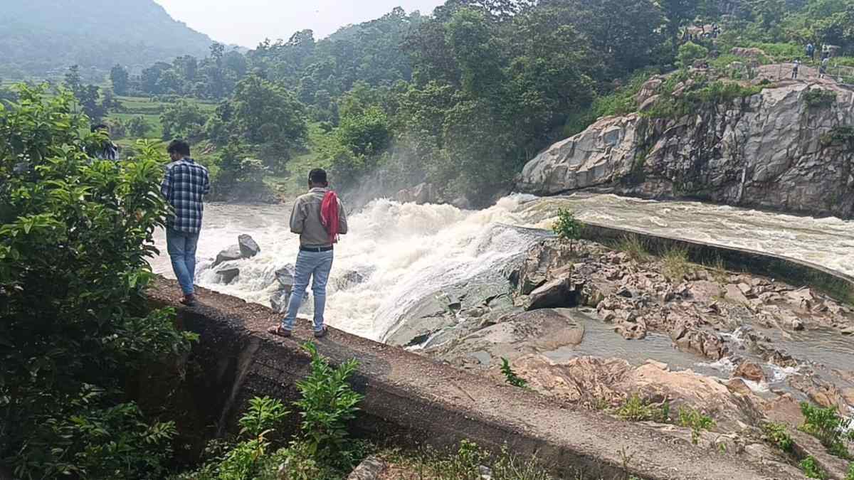 , Lormi. Due to heavy rains in Mungeli district of Chhattisgarh, all the rivers and streams are in spate. Khudiya dam is currently full to the brim, where tourists are arriving from far and wide to see the panoramic view. But despite the posters put up by the police post Khudiya, which prohibits taking selfies and photographs near the rocks and waterfalls, tourists are risking their lives by standing on the rocks and taking selfies.