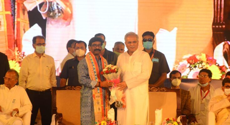Raipur, 28 October 2021 : Jharkhand Chief Minister Hemant Soren inaugurated the ‘National Tribal Dance Festival’ and ‘Rajyotsava 2021’ by lighting the lamp at Science College ground in Raipur, capital of Chhattisgarh, here today. Chhattisgarh Chief Minister Bhupesh Baghel presided over the function.