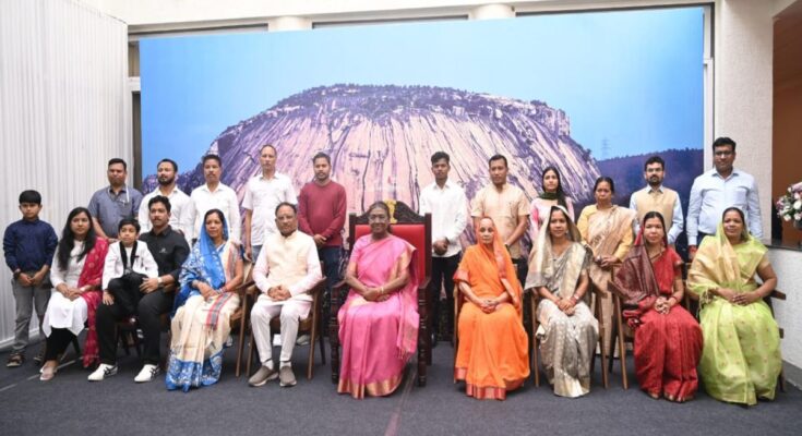Raipur. President Draupadi Murmu was in Chhattisgarh on her two-day visit. On the second day of her visit, President Murmu attended the luncheon hosted by Chief Minister Sai at the Chief Minister’s residence in Nava Raipur. During this, a group photo was taken of President Murmu with CM Sai and his family members, including officers and employees. The special thing about this group photo was that the beautiful Madheshwar mou