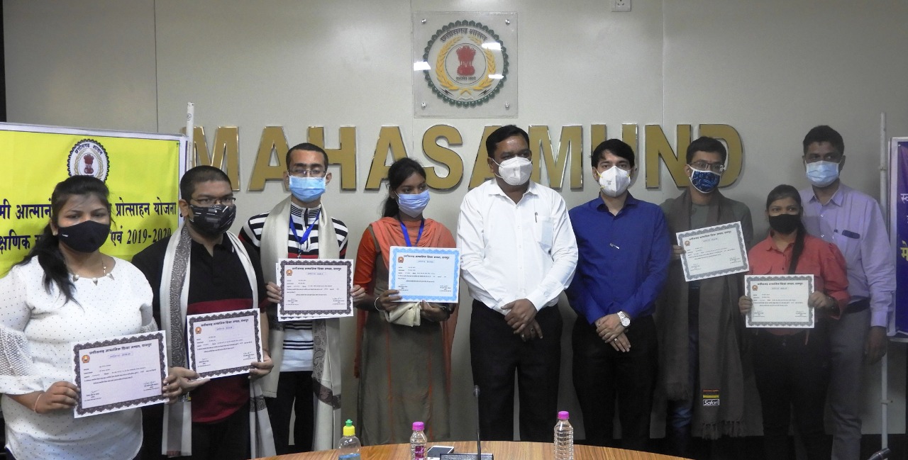 Mahasamund 23 May 2021. The students included in the merit list for the education session 2018-19 and 2019-20 were felicitated today by the Chief Minister of the state Mr. Bhupesh Baghel through a virtual medium. During this, he discussed with the students of various districts of the state and congratulated them and wished them a bright future. On this occasion, Collector Mr. Doman Singh, Chief Executive Officer of District Panchayat Mr. Akash Chhikara and students in the merit list from the district, Mr. Tilak Ram Jha, Mr. Komal Agarwal, Mr. Aditya Singh, Mr. Ankit Bhoi, Ku. Sanjana Aggarwal and Ku. Pushpa joined the Chief Minister through video conferencing from CG Swan Room at Chaudhary District Office.