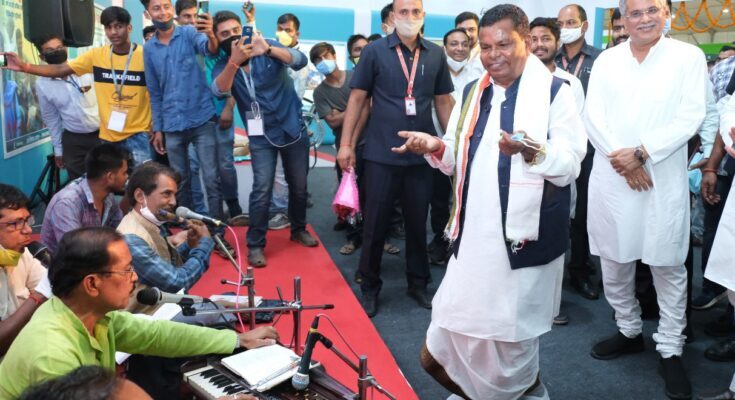 Raipur 30 October 2021: During the inspection of various stalls in the National Tribal Dance Festival and Rajyotsava, when Chief Minister Bhupesh Baghel and Excise Minister Mr. Kawasi Lakhma reached the stall of Social Welfare Department, then the message is being given through folk songs for drug de-addiction. Was. The Excise Minister Mr. Lakhma could not restrain himself to the tune of the folk song and started dancing to the rhythm and melody of the song. Chief Minister Shri Baghel also praised the songs of drug de-addiction by Kalapathak Dal and encouraged them.