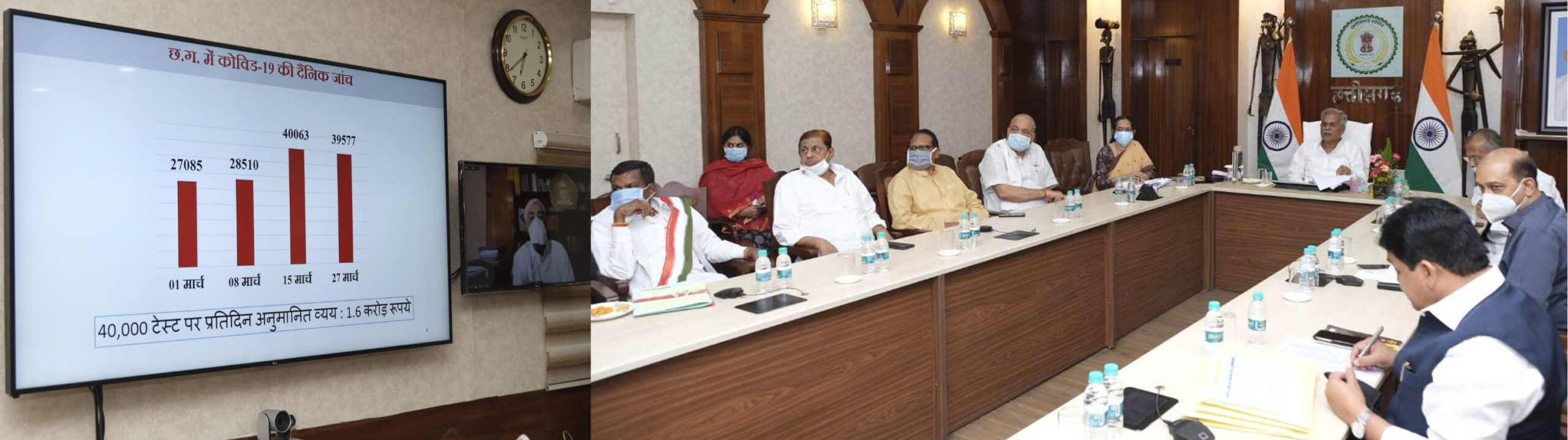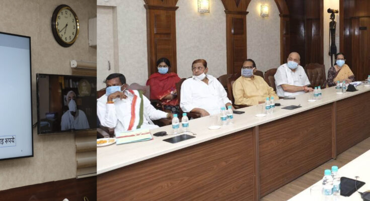 Raipur, 28 March 2021. A review meeting of prevention of Corona infection and Kovid-19 vaccination in the state is going on today at his residence office here under the chairmanship of Chief Minister Shri Bhupesh Baghel. Health Minister Shri T.S. Singhdev is involved in video conferencing. Home Minister Mr. Tamradhwaj Sahu, Agriculture Minister Mr. Ravindra Choubey, Forest Minister Mr. Mohammad Akbar, School Education Minister Dr. Premasai Singh Tekam, Industry Minister Mr. Kavasi Lakhma, Urban Administration Minister Dr. Shivkumar Dahria, Additional Chief Secretary to Chief Minister Mr. Subrata Sahu, Additional Chief Secretary Health Mrs. Renu G. Pillai, Secretary to the Chief Minister Mr. Siddarth Komal Singh Pardeshi, Commissioner Health Dr. C.R. Prasanna, Director Health Services Shri Neeraj Bansod, Director of National Health Mission, Dr. Priyanka Shukla and other senior officers are present.
