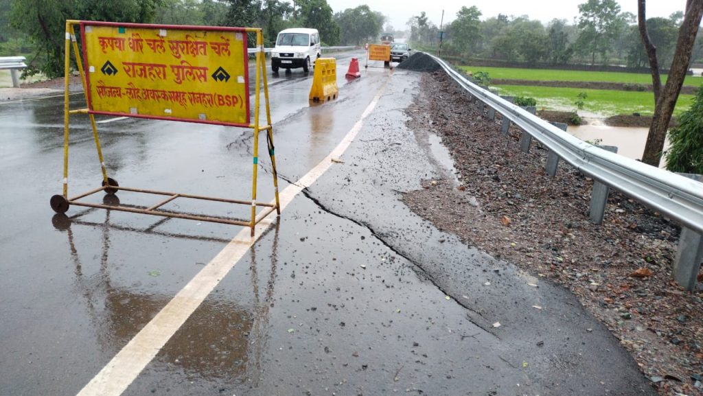 lease note that the road being constructed from Jhalmala to Sherpar at a huge cost of about 133 crores has developed cracks at several places, while on one side of the big bridge built on NH 930 from Kusumkasa to Balod, despite a returning wall made of concrete to prevent the soil put under the road from sliding, 10 metres of the road has sunk badly, while on the other side also 10 metres of the road has sunk by more than six inches and the approach road built from the side of this big bridge has also broken badly.