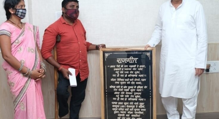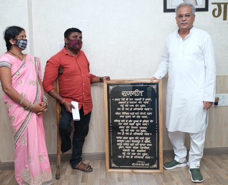 Divyang wood craftsman of Bemetara district, Mr. Dilharan Sinha and his wife Mrs. Kalindri Sinha had a courtesy call on Chief Minister Mr. Bhupesh Baghel at his residence office here today. On this occasion, he presented an artwork of Chhattisgarh’s Raj song made by hand engraved on wood to the Chief Minister. In this the signature of Dr. Narendra Dev Varma, the author of the song, has also been engraved. Appreciating his art-skills, Chief Minister Shri Baghel approved an amount of one lakh rupees from his voluntary donation to further the work of wood craft.