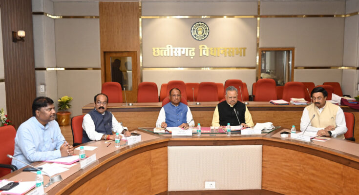Chief Minister Shri Vishnu Dev Sai, Leader of Opposition Dr. Charandas Mahant, Deputy Chief Minister Shri Arun Saw, Parliamentary Affairs Minister Shri Kedar Kashyap and members of the committee are present in the meeting.