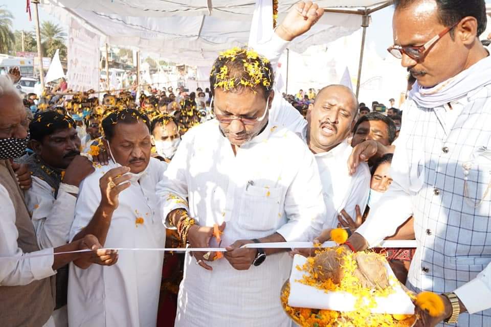 Raipur, 10 December 2020. Public Health Engineering and Village Industries Minister Guru Rudrakumar ji today inaugurated Naveen Jaitkham as a symbol of Baba Guru Ghasidas ji’s faith in village Narmada (Chaknar) of Rajnandgaon district. Minister Guru Rudrakumar welcomed the people of Satnami community with great affection. On this occasion, Minister Guru Rudrakumar said that the entire life of Guru Shhasromani Guru Ghasidas Baba Ji, the founder of Satnam Panth, has been devoted to the welfare of human society. He has given a similar message to the society in terms of brotherhood and harmony, it is relevant even today. He appreciated the youth of Satnami society and said that Satnam was taken out in five stages to unite the society in the state and to spread the message of human service, mercy, compassion on all the creatures of Baba Guru Ghasidas Ji to the people. His participation in the Sandesh Yatra is exemplary.