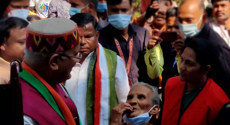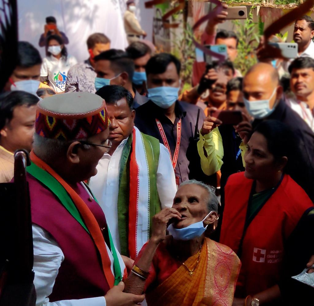 During the stay of Chief Minister Bhupesh Baghel in Bastar, emotional scenes were present on many occasions today. One such scene was seen when the eyes of an elderly woman became moist after receiving affection and respect from the Chief Minister in Sian Vatika. He touched the face of Chief Minister Mr. Baghel with his trembling hands and kissed his fingers.
