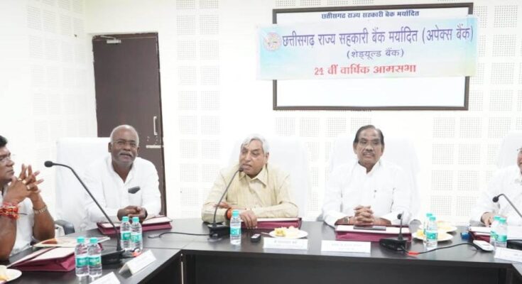 24th Annual General Meeting of Apex Bank held Raipur, 29 September 2023 Apex Bank has earned a profit of Rs 34.42 crore this year. This information was given by Shri Baijnath Chandrakar, Chairman of Apex Bank in the 24th Annual General Meeting held today at Chhattisgarh State Cooperative Bank (Apex Bank), Nava Raipur. While presenting the financial statement and income-expenditure in the annual general meeting, he said that the share capital of Apex Bank is Rs 186 crore, funds (reserves) are Rs 599 crore, loans and advances are Rs 3757 crore, own funds are Rs 379 crore. In the general meeting, representative and MLA from Chhattisgarh Housing Association Mr. Satyanarayan Sharma, Apex Bank Director Mr. Dwarika Sahu, Apex Bank Director Mr. Rakesh Singh Thakur, District Cooperative Central Bank Raipur President Mr. Pankaj Sharma, Secretary Cooperative Chhattisgarh Government representative Deputy Secretary Mr. P.S. Sarpraj, Apex Bank Managing Director Mr. KN Kande, Registrar Cooperative Chhattisgarh representative Mr. Umesh Tiwari, CEO District Cooperative Central Bank Durg Mrs. Apeksha Vyas and Ambikapur Mr. SK Verma, representative of Apex Bank Employees Cooperative Credit Society Raipur Mr. Ajay Bhagat, Food Corporation of India employee Representatives of Credit Committee Raipur, Citizens Cooperative Bank Raipur Mr. RK Thakur, Mahila Citizens Cooperative Bank Mahasamund Mrs. Anita Raote, Bhilai Citizens Cooperative Bank representative, Citizens Cooperative Bank Durg representative Mr. Rungta ji, Lakshmi Mahila Citizens Cooperative Bank Mr. Manjeet Singh Hura and general assembly. Representatives of were present.