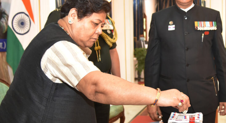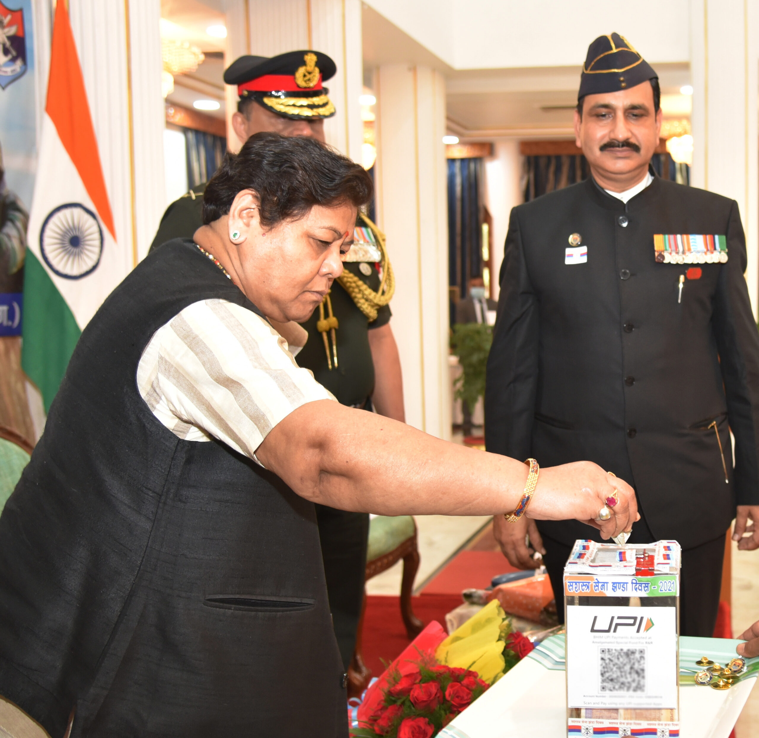 Raipur, 07 December 2021. Governor Ms. Anusuiya Uikey presented the Armed Forces Flag.