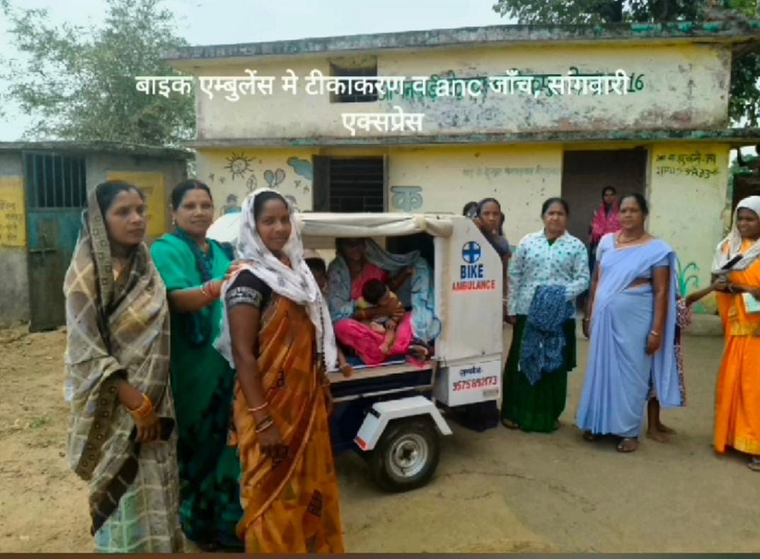 in Amagaon. Pregnant women from forest areas are transported to centers for institutional deliveries, and postpartum mothers are safely taken home after delivery using these bike ambulances.