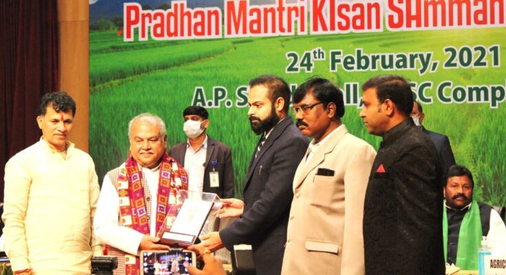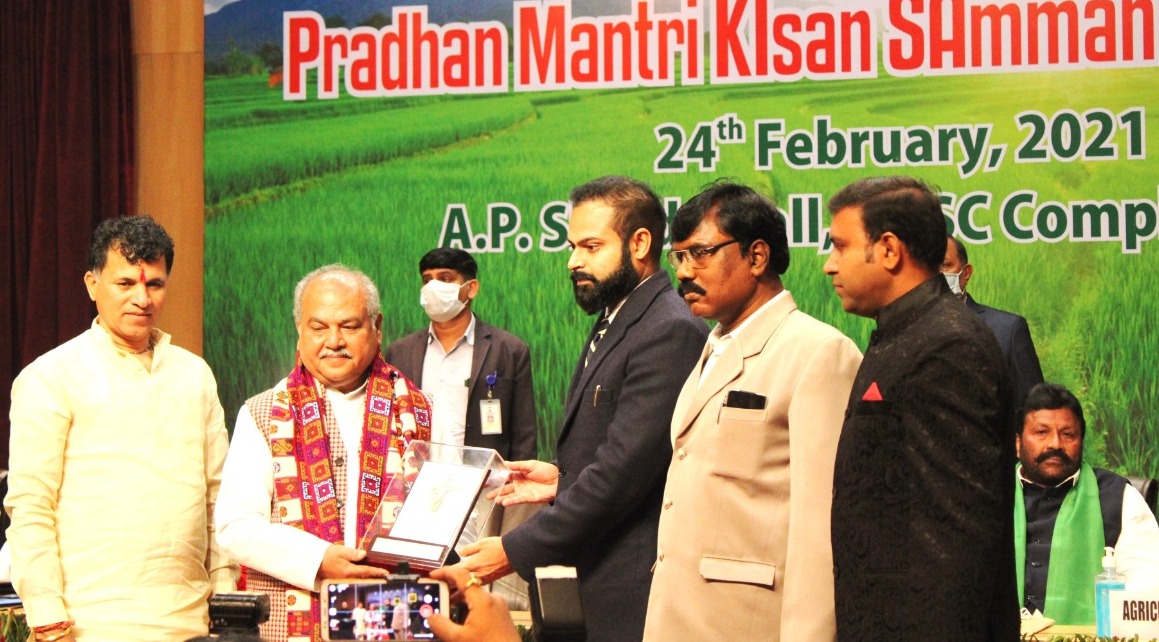 Raipur , 24 February 2021. Bilaspur district of Chhattisgarh has achieved the highest position in the country in the implementation of Pradhan Mantri Kisan Samman Nidhi Yojana. Union Minister of Agriculture and Farmers Welfare Shri Narendra Tomar today awarded the Bilaspur district for this glorious achievement in a program organized in New Delhi on the occasion of completion of two years of this scheme. Collector of Bilaspur, Dr. Summary Mitter and State Nodal Officer of Prime Minister Kisan Samman Nidhi Yojana, Shri G.K. Nirmam received this award. Union Minister of State for Agriculture Shri Kailash Chaudhary was also present at the award ceremony.