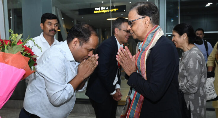 Dr. Arvind Panagariya, Chairman of the 16th Central Finance Commission, arrived at Swami Vivekananda Airport in Raipur on Wednesday for a four-day visit to Chhattisgarh. He was accompanied by Commission members Shri Ajay Narayan Jha, Smt. Annie George Mathew, Dr. Manoj Panda, Dr. Soumya Kanti Ghosh, Secretary Shri Ritvik Pandey, Joint Secretary Shri Kamal Kumar Mishra, Joint Director Shri Raghavendra Singh, and other delegation members. They were warmly welcomed by Finance Department Secretary Shri Mukesh Bansal, NRDA CEO Shri Saurabh Kumar, State Election Commission Secretary Dr. Sarveshwar Bhure, CGMSC MD Smt. Padmini Bhoi, and Raipur Collector Dr. Gaurav Singh. They were welcomed with state ‘gamcha’ and flower bouquets.