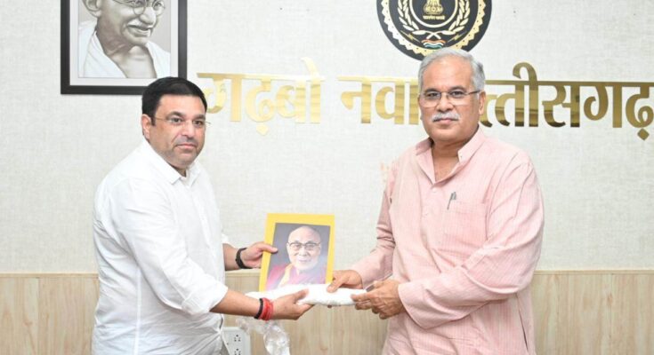 Sirpur Special Area Development Authority Chairman Mr. Satish Jaggi met Chief Minister Mr. Bhupesh Baghel at his residence office this evening. Mr. Jaggi informed the Chief Minister about his meeting with the Buddhist Guru, Mr. Dalai Lama. Mr. Jaggi said that during the meeting with the Dalai Lama in Dharamshala, Himachal Pradesh, he informed the Dalai Lama about the intention of the Chief Minister Mr. Baghel to develop the Buddhist heritage of Sirpur and establish it in the World Heritage and Gurugram sent by the Chief Minister. He was handed over an invitation letter to attend the World Buddhist Meeting to be held in Sirpur from 6 to 9 September 2023. Mr. Jaggi presented the state gamchha and memento of Chhattisgarh state to the Dalai Lama on the occasion. He told the Chief Minister that the Dalai Lama has made efforts to preserve the Buddhist heritage in Chhattisgarh.