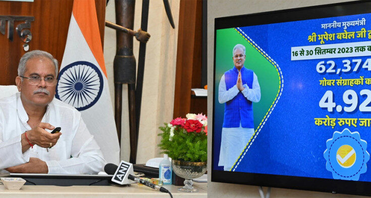 Chief Minister Shri Bhupesh Baghel today transferred Rs 9.65 crore to the accounts of the beneficiaries of Godhan Nyay Yojana. This amount includes Rs 4.93 crore to cow dung sellers, Rs 1.45 crore to Gauthan committees, Rs 1.14 crore as dividend to self-help groups and an honorarium of Rs 2.26 crore to Gauthan committee members. Including the amount distributed today, Rs 588.83 crore has been paid to the beneficiaries under Godhan Nyay Yojana.