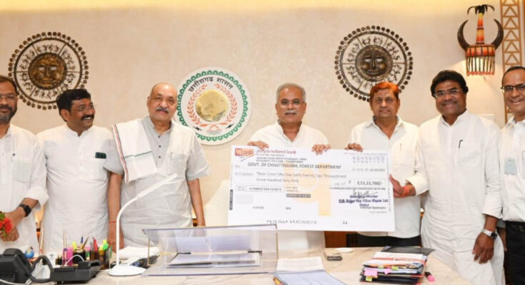 Chief Minister Mr. Bhupesh Baghel was given the dividend of Chhattisgarh State Forest Development Corporation for the year 2021-22 by Forest Minister Mr. Mohammad Akbar and Chairman of Chhattisgarh State Forest Development Corporation Mr. Devendra Bahadur Singh in his office room located in the Vidhansabha Complex today. A cheque of Rs 3.51 crore was handed over to the Chief Minister. On this occasion, Agriculture Minister Mr. Ravindra Choubey, Advisor to Chief Minister Mr. Rajesh Tiwari, Principal Secretary Forest Department Mr. Manoj Kumar Pingua, Principal Chief Conservator of Forests and Chief of Forest Force Mr. Sanjay Shukla and Principal Chief Conservator of Forests and Managing Director, Chhattisgarh State Forest Development Corporation Mr. A.K. Bhatt were present.