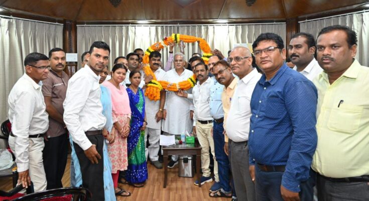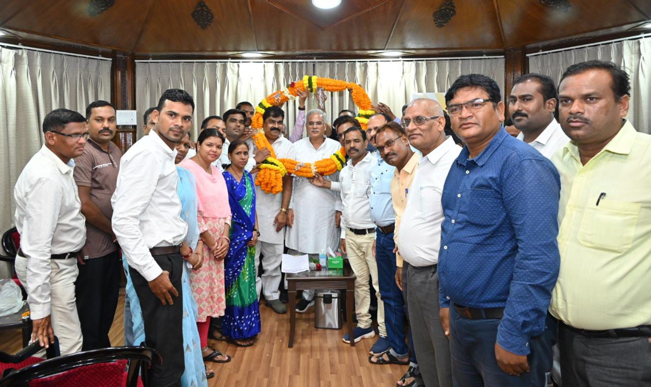 The delegation of Chhattisgarh Joint Teachers Association paid courtesy call on Chief Minister Mr. Bhupesh Baghel at his residence office here today. The delegation expressed gratitude to Chief Minister Mr. Baghel by garlanding him for the decisions taken in the interest of government employees. The delegation said that all the decisions of the Center including equal DA and house rent hike are historic in the interest of the employees. Due to these gifts, there is a wave of enthusiasm among all the employees including teachers across the state. On this occasion, President of Chhattisgarh United Teachers Federation Mr. Rajnarayan Dwivedi, Mr. Krishna Kumar Navrang, Mr. Bhupendra Singh Banafar, Mr. Shankar Sahu, Mr. Shiv Sarathi, Mr. Vikram Rai, Mr. Dharmdas Banjare, Mr. Chetan Kumar Baghel, Mr. Kamal Das Murchale and others were present.