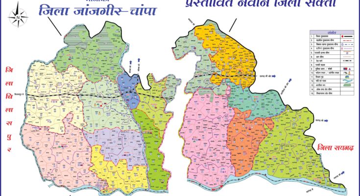 Similarly, the proposed new district Sakti will include a total of 5 tehsils including Tehsil Sakti, Malkharoda, Jaijaipur and Tehsil Dabhra of subdivision Sakti. The newly formed Sakti district is bounded by Kartala Tehsil (District Korba) in the north, Sarangarh (District-Raigarh) in the south. , Kharsia (District-Raigarh) in the east and Saragaon, Bamhanidih tehsil (Janjgir Champa) in the west. Sakti district consists of 2 sub-divisions (sub divisions) Sakti and Dabhra (new district Sakti includes proposed sub-divisions of Malkharoda and Jaijaipur) 5 tehsils respectively- Sakti, Dabhra, Jaijaipur, Malkharoda and new Baradwar (proposed tehsil Adbhar) Sub Tehsil- Chandrapur, Hasaud, Bhothiya and 4 Block/District Panchayats will include Sakti, Jaijaipur, Malkharoda and Dabhra respectively.