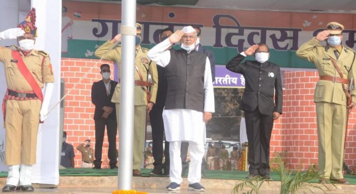 Raipur, 26 January 2021. Chief Minister Bhupesh Baghel hoisted the flag at a function organized at Lalbagh in Jagdalpur on the occasion of 72nd Republic Day. On this occasion, he congratulated the people of the Republic Day and best wishes. The Chief Minister released colorful balloons symbolizing joy and gaiety. On the Republic Day, Chief Minister Mr. Baghel gave a message to the people regarding the works, policies and plans and achievements being made by the state government for the continuous development of the state. Republic Day was celebrated with great enthusiasm in Bastar Zone.