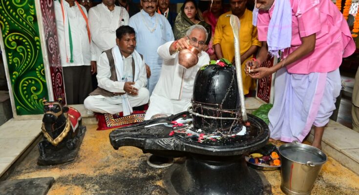 Chief Minister Bhupesh Baghel today reached village Chhak in Dharamjaygarh assembly constituency of Raigad district as part of his meet-and-greet program. On reaching here, the Chief Minister was accorded a grand welcome by the dancers with musical accompaniment. There was a lot of enthusiasm among the villagers to meet the Chief Minister. In the program, the children of Swami Atmanand School paid attention to the placard “Thank you CM sir” and “English education of the children”. He thanked the Chief Minister with a slogan like ‘Maan diya to poor children’. The Chief Minister started the meeting at Chhak by offering prayers at “Om Amriteshwar” Mahadev temple located at village Chhak (Vrindavan). He also prayed for the happiness and prosperity of the people of the state by duly anointing the water of Om Amriteshwar Mahadev. The Chief Minister planted a red sandalwood plant of religious and Ayurvedic importance in the temple premises. Chief Minister Shri Bhupesh Baghel also unveiled the statue of late Shri Chaneshram Rathia, a prominent tribal leader and former minister of the state in Vrindavan Chhak. Assembly Speaker Dr. Charandas Mahant, School Education Minister Dr. Premsai Singh Tekam, Higher Education Minister Mr. Umesh Patel, MLA Mr. Laljit Singh Rathia, MLA Mr. Chakradhar Singh Sidar, MLA Mr. Ramkumar Yadav, in other programs including meeting and meeting.