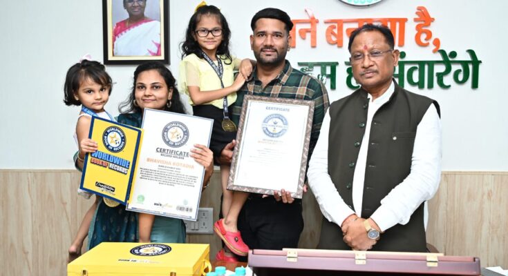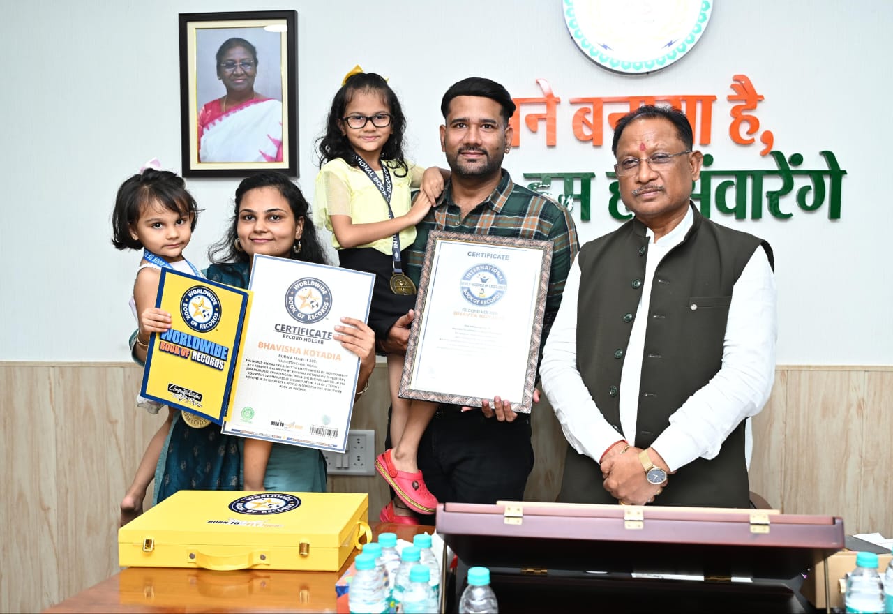 6-year-old Bhavya and 3-year-old Bhavisha Kotdiya met Chief Minister Shri Vishnu Dev Sai today at his residence office along with their parents. Bhavya knows the names of inventors and 3-year-old Bhavisha knows the names of 100 country capitals by heart. Bhavya holds the World Record of Excellence for naming the inventors of inventions the fastest after hearing their names. Bhavya achieved this feat by naming 50 inventors in 1 minute 35 seconds. Similarly, Bhavisha holds the record of naming 100 country capitals in 2 minutes 21 seconds in the Worldwide Book of Records. Chief Minister Shri Vishnu Dev Sai praised these little daughters for this great achievement at such a young age and blessed them for their bright future. The father of these girls, Shri Gaurav Kotdiya, informed Chief Minister Shri Sai about the achievements of his daughters and showed them their certificates and medals. The mother of the girls, Mrs. Namita Kotdiya was also present on this occasion.
