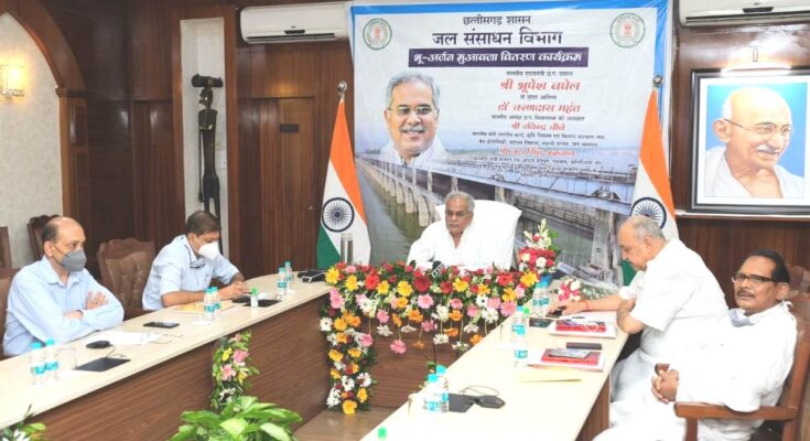 Raipur, 22 July 2021. Chief Minister Shri Bhupesh Baghel congratulated and congratulated all the farmers by distributing checks amounting to Rs 22.78 crore as land acquisition compensation to 314 farmers of Chandrapur area of Janjgir-Champa district affected by Kalma barrage. This virtual program of compensation distribution was organized at the Chief Minister’s residence office today. Water Resources Minister Shri Ravindra Choubey, School Education Minister Dr. Premsai Singh Tekam, Chief Secretary Shri Amitabh Jain, Additional Chief Secretary to Chief Minister Shri Subrata Sahu were present in the program. Assembly Speaker Dr. Charandas Mahant, Revenue and Disaster Management Minister Mr. Jaisingh Agarwal, Parliamentary Secretary Mr. Vinod Seven Lal Chandrakar, MLA Mr. Ramkumar Yadav and other public representatives participated in this program through video conferencing.