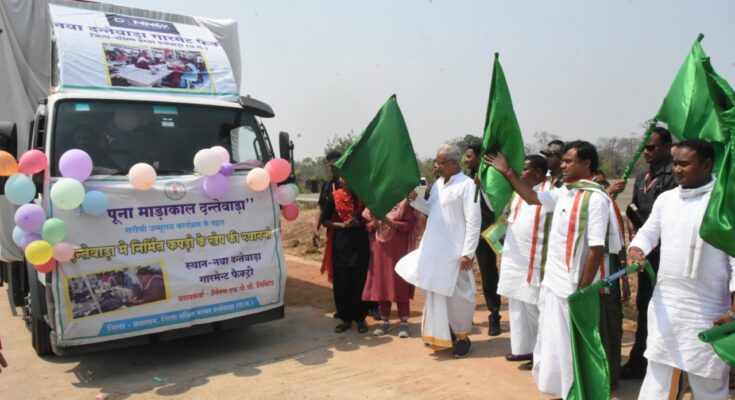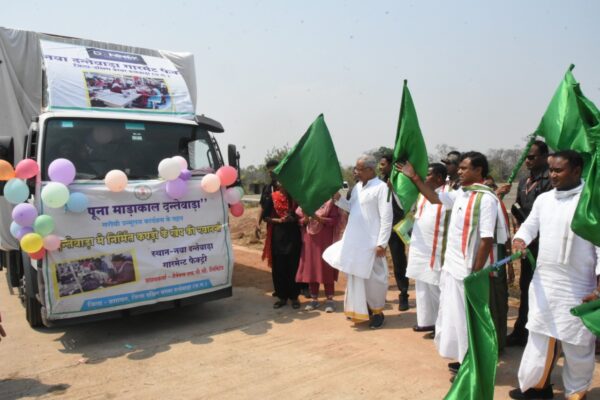 Raipur, 03 April 2022.Chief Minister Bhupesh Baghel during his stay in Dantewada on Saturday, 03rd April, flagged off a lot of 32500 Danex clothes worth 1 crore 89 lakh from Police Line Karli. On this occasion, Minister in-charge of the district Mr. Kawasi Lakhma, MP Bastar Mr. Deepak Baij, MLA Mrs. Devati Mahendra Karma, Vice President of Plant Board Mr. Chhabindra Karma, Collector Mr. Deepak Soni, Senior Superintendent of Police Mr. Siddharth Tiwari and other public representatives and senior officials were present.