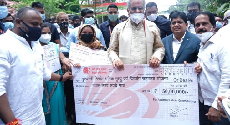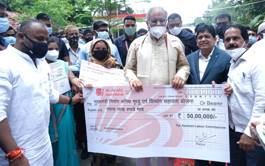 It is worth mentioning that as per the announcement of Chief Minister Bhupesh Baghel, Chhattisgarh Building and other construction workers under the Labor Department, under the Chief Minister Construction Workers Death and Divyang Sahayata Yojana, Rs. A provision has been made to give Rs. Earlier, there was a provision of giving only 30 thousand rupees under Vishwakarma Yojana on the death of factory workers by the Board, which has been increased to one lakh rupees from January 1, 2019 after the announcement of Chief Minister Shri Bhupesh Baghel. Under this scheme, Chief Minister Bhupesh Baghel gave a check of Rs.