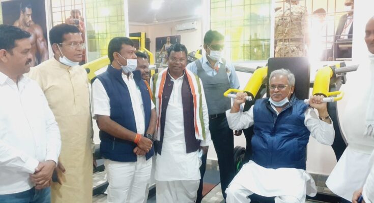 Raipur, 01 February 2021. Encouraging the youths who have played a major role in the progress of the country and the state to improve their health, Chief Minister Bhupesh Baghel said that healthy and positive thoughts reside in a healthy body. With which a person can enjoy the whole life along with his routine. He described daily exercise and yoga as important for a successful routine. Mr. Baghel inspired the youth by exercising themselves in the gym during the observation of the fitness center at Swami Vivekananda campus of Sukma, Vananchal tribal area today. Industries Minister Mr. Kavasi Lakhma, Revenue Minister Mr. Jaisingh Agrawal, MP Bastar Mr. Deepak Badge and MLA Mr. Mohan Markam were also present on the occasion.