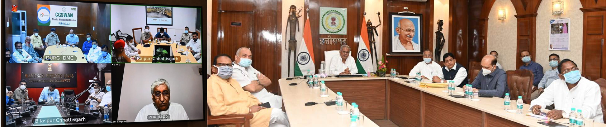 Health Minister Shri T.S. Singhdev is involved in video conferencing. Home Minister Mr. Tamradhwaj Sahu, Agriculture Minister Mr. Ravindra Choubey, Forest Minister Mr. Mohammad Akbar, School Education Minister Dr. Premasai Singh Tekam, Food Minister Mr. Amarjeet Bhagat, Industry Minister Mr. Kavasi Lakhma, Urban Administration Minister Dr. Shiv Kumar Dahria, Chief Minister in Chief Minister’s residence. Additional Chief Secretary, Shri Subrata Sahu, Additional Chief Secretary Health, Renu G. Pillai, Secretary to Chief Minister Mr. Siddartha Komal Singh Pardeshi, Commissioner Health Dr. C.R. Prasanna, Director Health Services Shri Neeraj Bansod, Director of National Health Mission, Dr. Priyanka Shukla and other senior officers were present.
