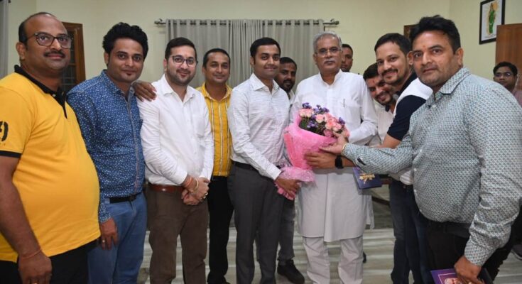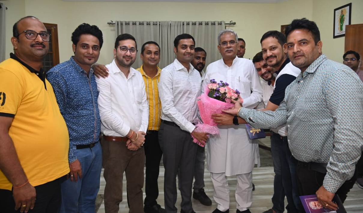 A courtesy call on Chief Minister Bhupesh Baghel by a delegation of Maheshwari Samaj led by Shri Rajesh Mantri at his residence office here this evening. The delegation invited the Chief Minister to attend the upcoming National Cultural Festival of Maheshwari Samaj “Hum Hain Superstar” as the Chief Guest. He told the Chief Minister that this event is a big cultural festival of Maheshwari Samaj, in which talents from 28 states and a large number of people will participate. On this occasion, Raipur District President of Maheshwari Samaj Ramesh G Jhanwar, Mahesh G Somani, Alok Maheshwari, Nilesh Mundada, Lalit Somani, Murli Gilda, Yogesh Somani, were present