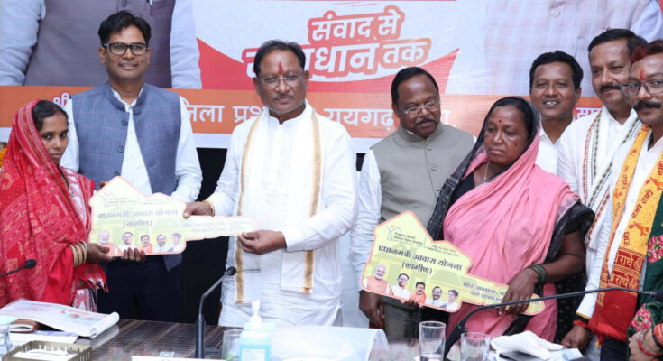 Chief Minister Shri Vishnu Dev Sai handed over the keys of concrete houses to five women including women of special backward tribes under the Pradhan Mantri Awas Yojana after a review meeting in Raigarh today. On this occasion, he handed over the keys of their new houses to Dilmat Bai, Guruvari Bai and Shaniro Bai of Birhor tribe of Kida village of Dharamjaygarh development block.