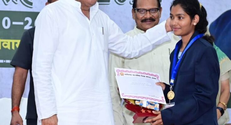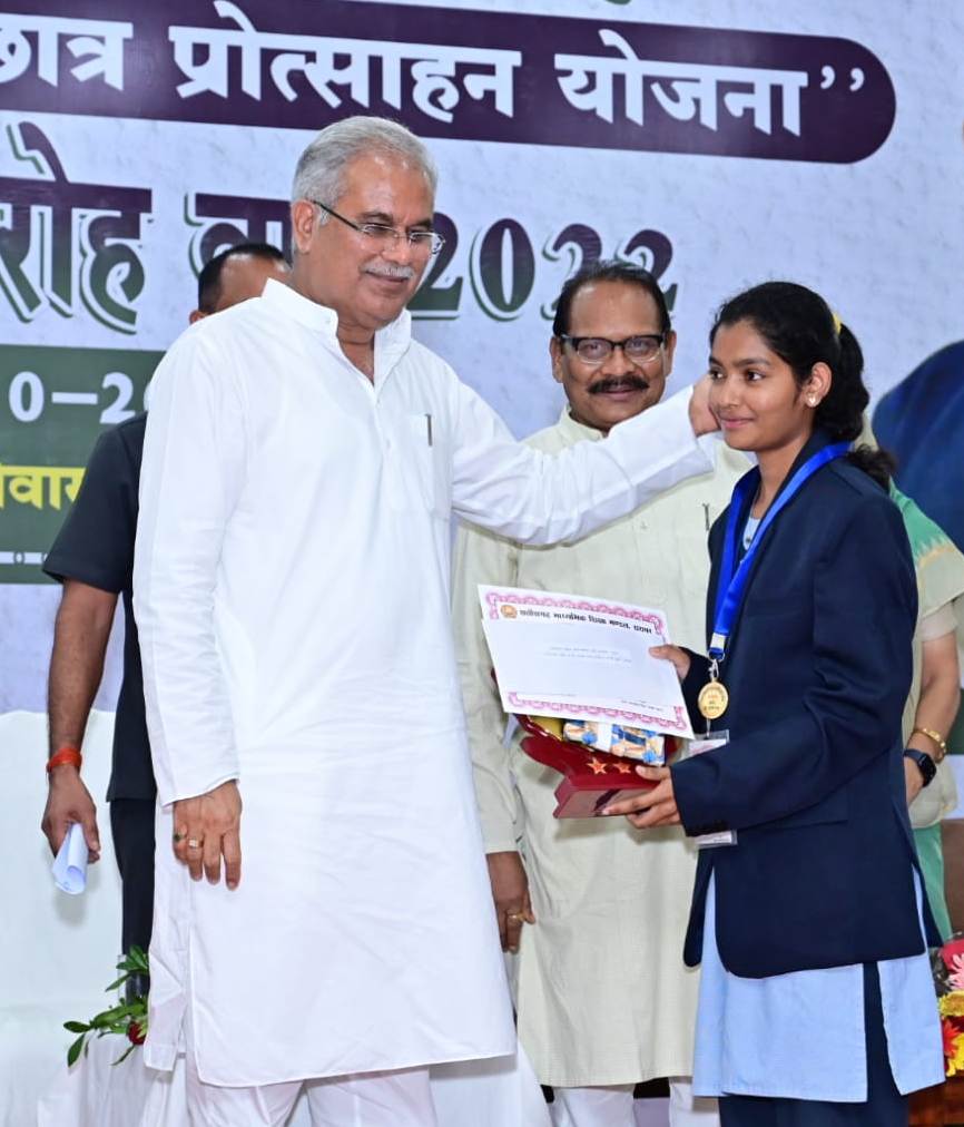 Chief Minister Shri Bhupesh Baghel today felicitated the students who got place in class 10th and 12th merit list in the year 2022 annual examination of Chhattisgarh Board of Secondary Education under Swami Atmanand Medhavi Chhatra Protsahan Yojana. In a program organized in the Chief Minister’s residence complex, the Chief Minister awarded gold medal to class 12 topper Kunti Sao of Raigad district and Khushboo Wadhwani of Bilaspur district, who secured second position, with silver medal. Similarly, in the merit list of class 10th, gold medal was given to Suman Patel of Raigarh and Sunali Bala of Kanker jointly and silver medal to Pankaj Kumar Sahu, who got second place in Kabirdham district. An incentive amount of Rs. 1.5 lakh each was given to all the meritorious students in the function. Chief Minister Shri Bhupesh Baghel gave the incentive amount to the banks of meritorious students in the function.