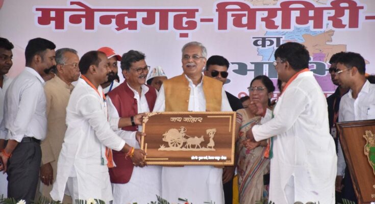 Chief Minister Shri Bhupesh Baghel inaugurated Manendragarh-Chirmiri-Bharatpur district in a program organized at Manendragarh today. Along with this, he inaugurated and performed Bhoomi Pujan of development works worth Rs 200 crore 73 lakh. On this occasion, the Chief Minister was welcomed by wearing a garland, crown, floral showers and saropa. The Chief Minister thanked the people of the area for his unprecedented felicitation and extended his congratulations and best wishes for the new district.