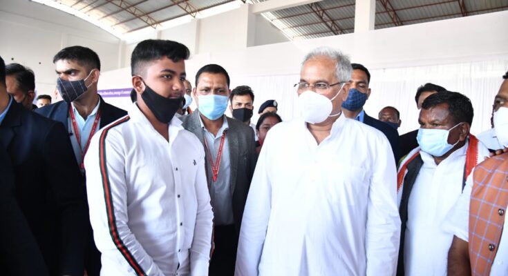 Raipur , 25 January 2022. Chief Minister Bhupesh Baghel today met the national level players of Bastar while observing the works under construction in the sports complex and wished them all the best for their bright future. The Chief Minister met Kumari Radhika Poyam, who displayed her talent at the national level 4 times in archery during her visit to the sports complex. Kumari Radhika won the gold medal in the Sub Junior Archery National Competition.
