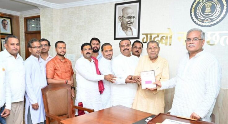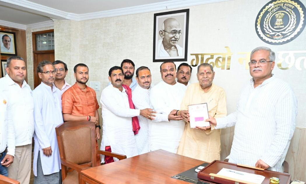 A delegation of Shri Shankaracharya Jankalyan Nyas Kawardha called on Chief Minister Mr. Bhupesh Baghel at his residence office this evening. The delegation invited the Chief Minister to attend the Chaturmasya Vrat Utsav of Jyotish Peethadhishwar Jagatguru Shankaracharya Swami Shri Avimukteshwaranand Saraswati Ji Maharaj. He told the Chief Minister that Chaturmasya Vrat Utsav would be organized at Paramhansi Ganga Ashram, Shridham (Gotegaon) in Madhya Pradesh from July 3 to September 29. Chief Minister Mr. Baghel thanked the delegation for the invitation to Chaturmasya Vrat Utsav.